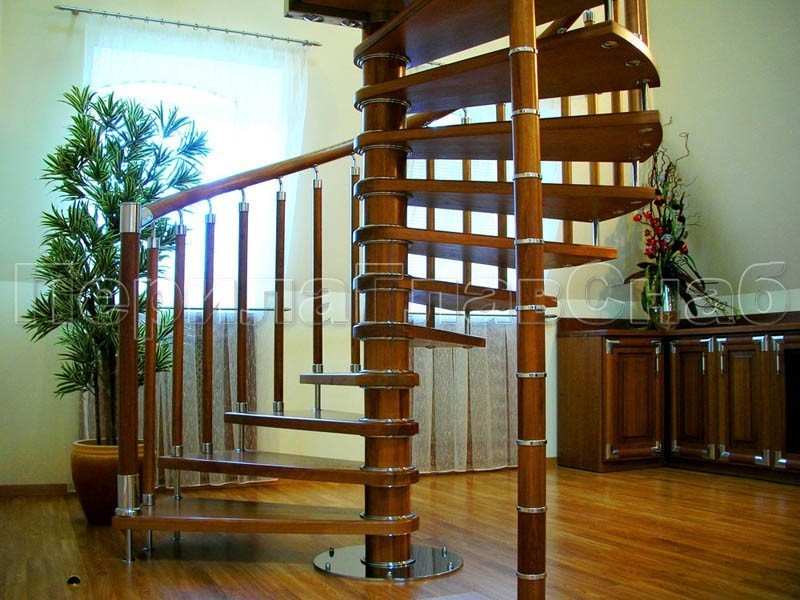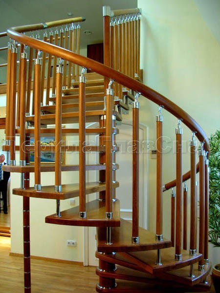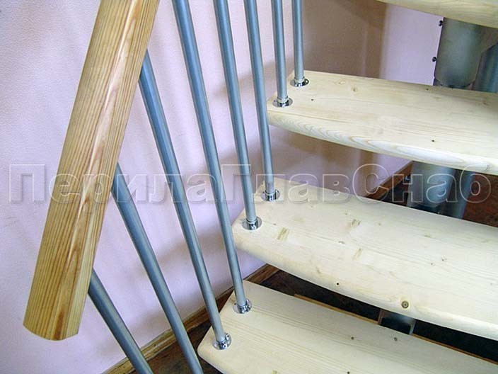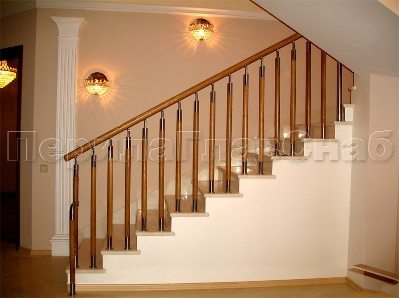 Ограждения со стойками в каждую ступень с круглым деревянным поручнем без ригелей