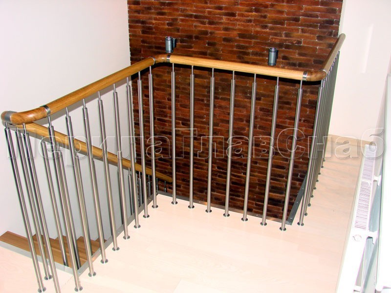 Нержавеющие ограждения без ригелей с круглым поручнем и стойками с деревянными вставками