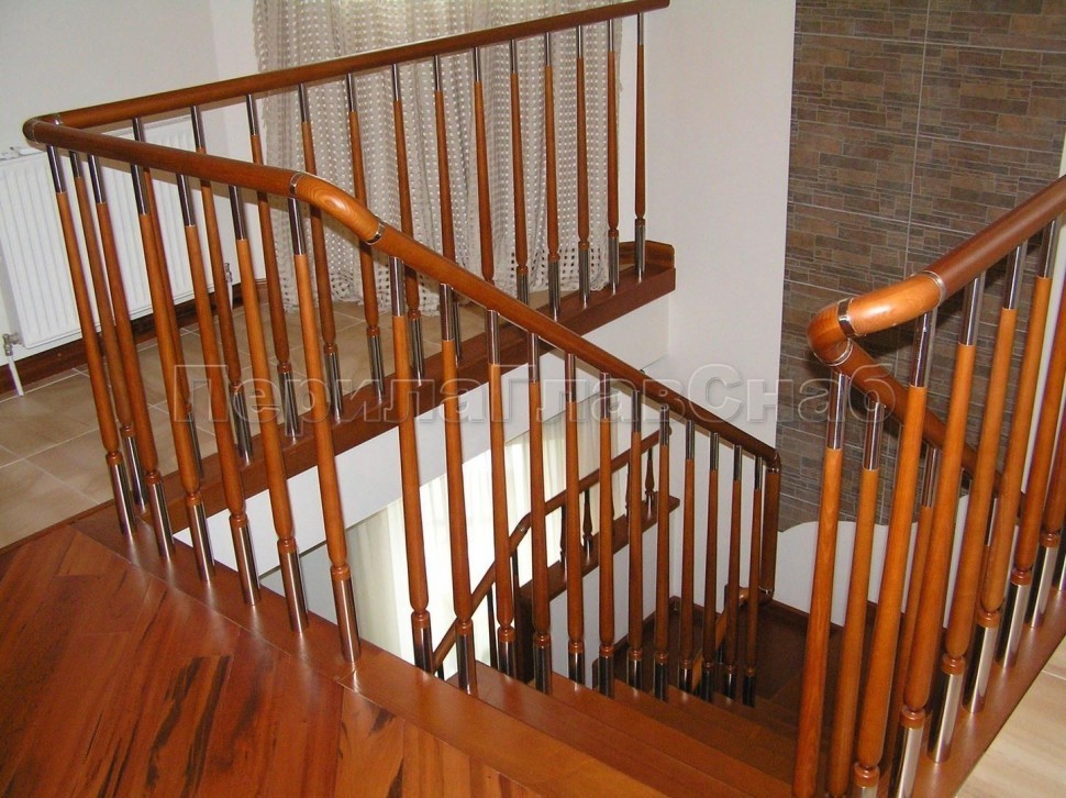 Три ригеля на сварке, квадратный деревянный поручень и круглые стойки