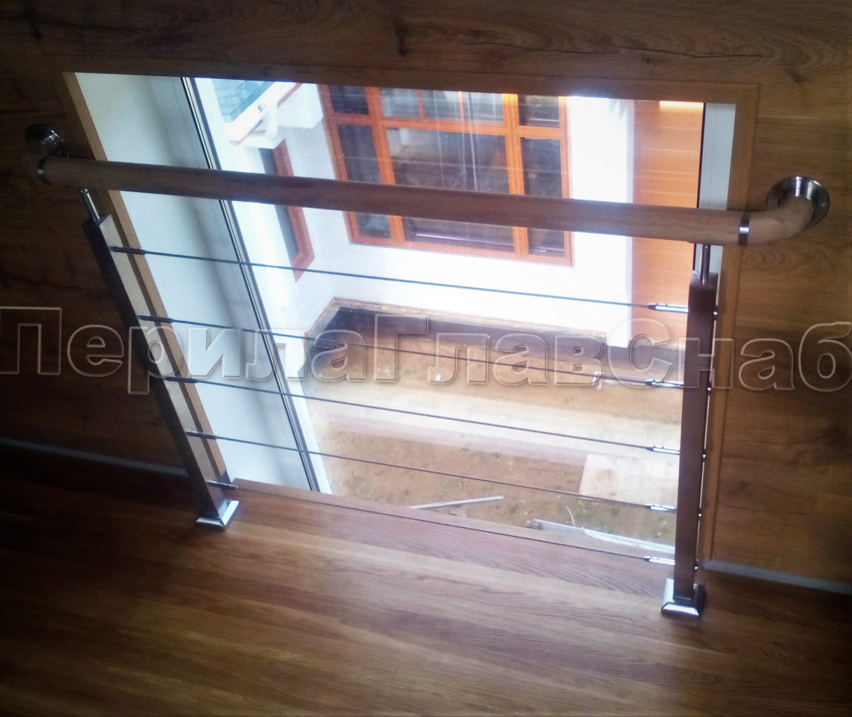 Четыре ригеля на держателях, квадратный деревянный поручень и квадратные стойки