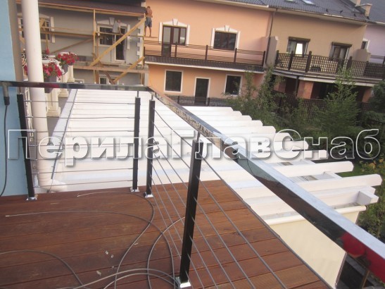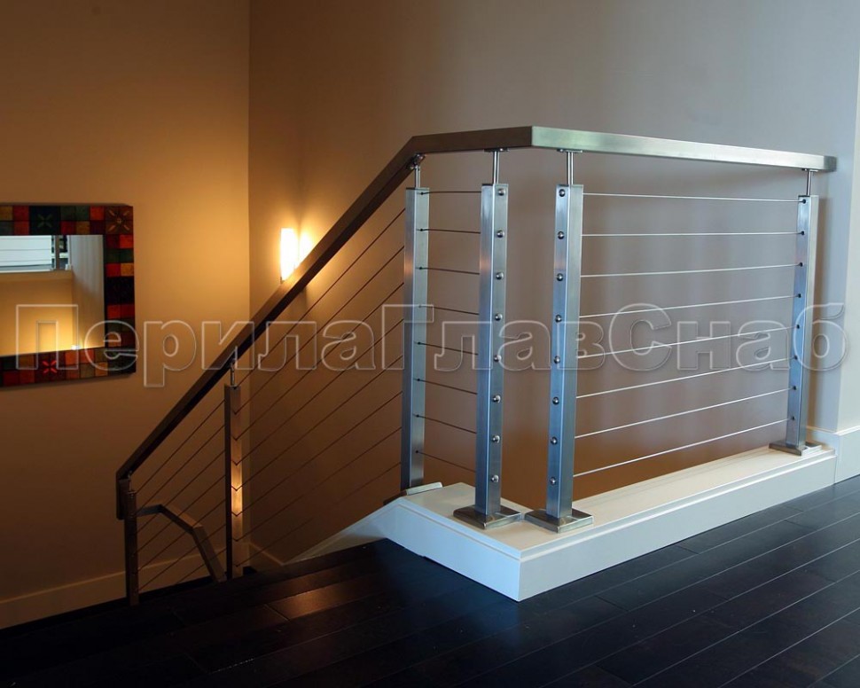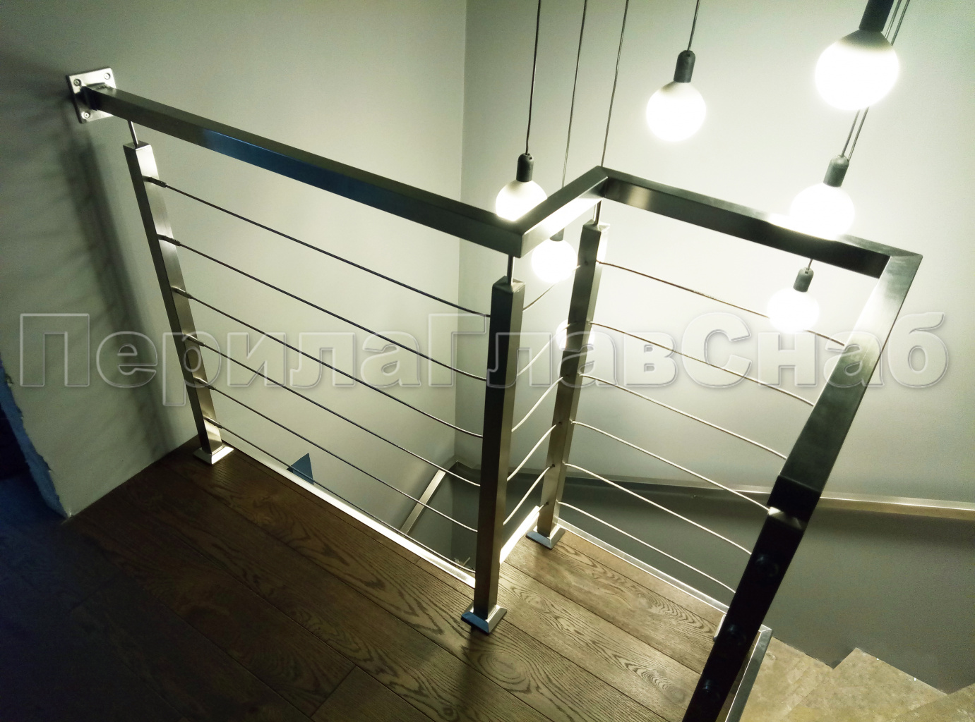 Ограждения из нержавейки. Заполнение из 4х тросиков. Квадратные стойки.