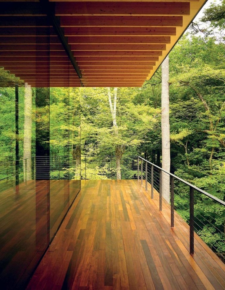 Нержавеющие ограждения без ригелей с круглым деревянным поручнем и стойками с деревянными вставками
