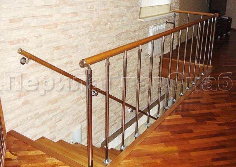 Три ригеля на сварке, квадратный деревянный поручень и круглые стойки
