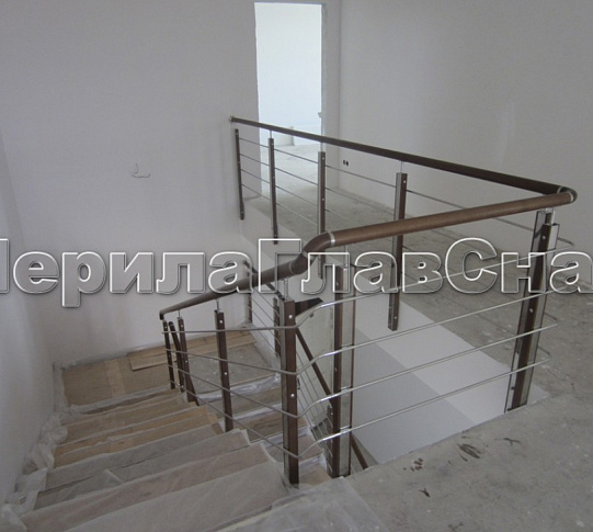 Нержавеющие ограждения без ригелей с круглым деревянным поручнем и стойками с деревянными вставками