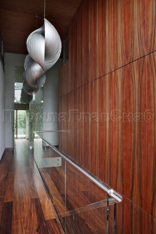 Ограждение с деревянным поручнем на точечном креплении на лестнице