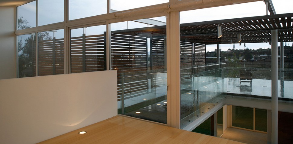 Ограждение с профильным поручнем с пазом на точечном креплении на лестнице