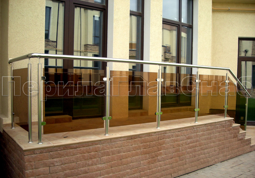 Ограждение для лестницы из нержавейки с зажимными стеклодержателями для крыльца в Волгограде. Готовые проекты ПерилаГлавСнаб