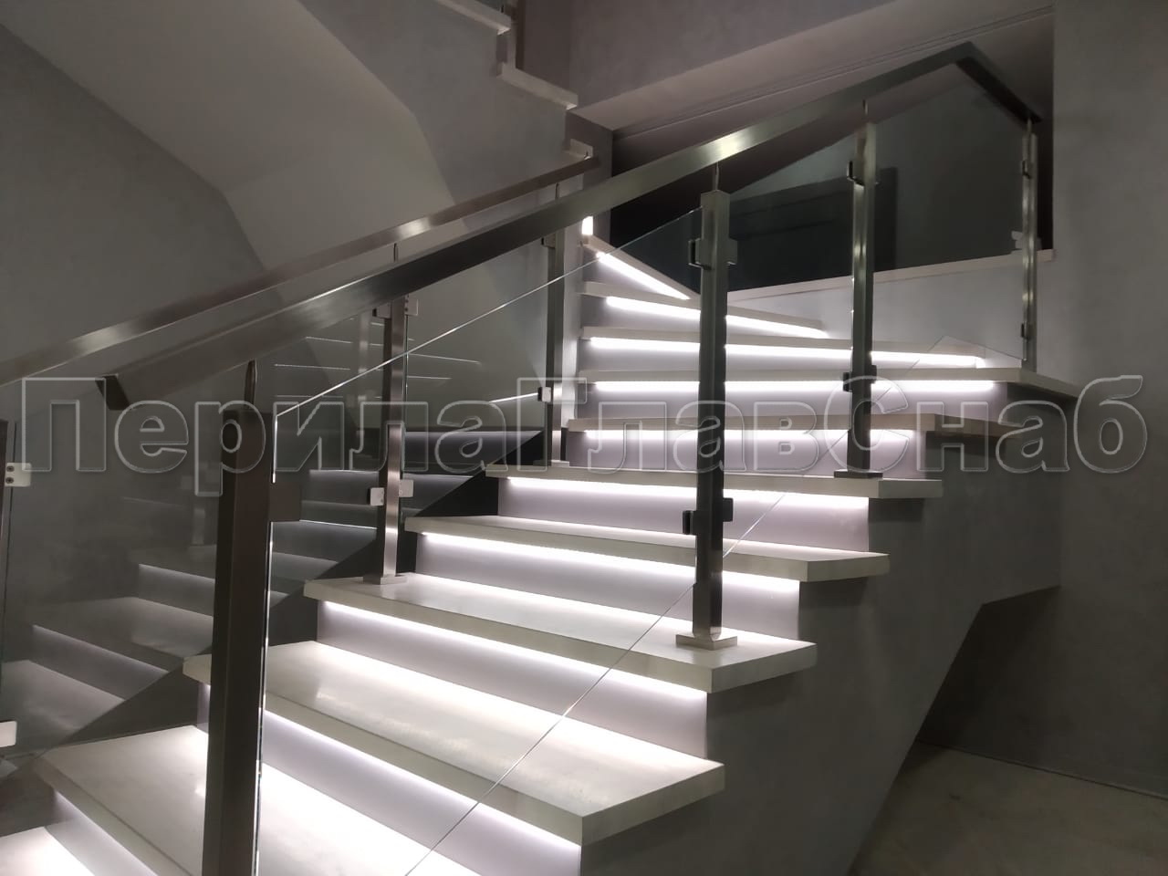 Ограждения лестницы без поручня с зажимными стеклодержателями и стойками в Волгограде. Готовые проекты ПерилаГлавСнаб