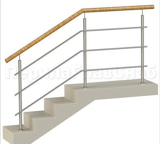 Три ригеля на сварке, квадратный деревянный поручень и круглые стойки