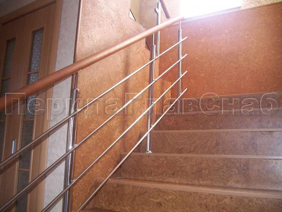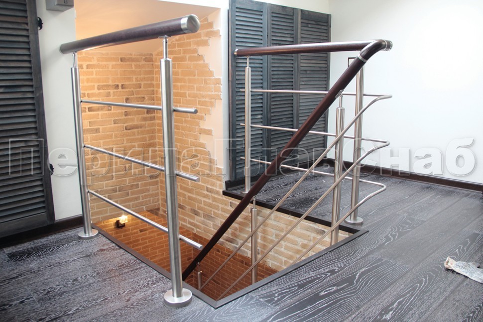 Нержавеющие ограждения без ригелей с круглым поручнем и стойками с деревянными вставками
