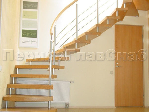 Ограждения с двумя стойками в каждую ступень с деревянным поручнем и без ригелей