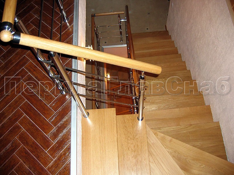 Ограждения со стойками в каждую ступень с круглым деревянным поручнем без ригелей
