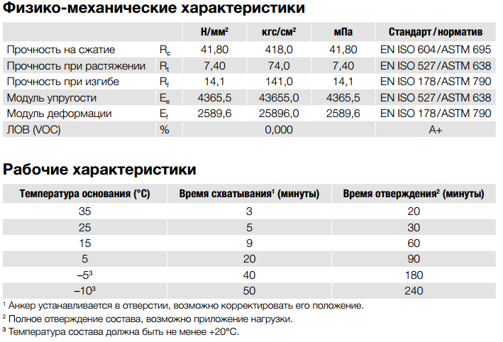 • Время схватывания и отверждения состава химического анкера BIT-PE