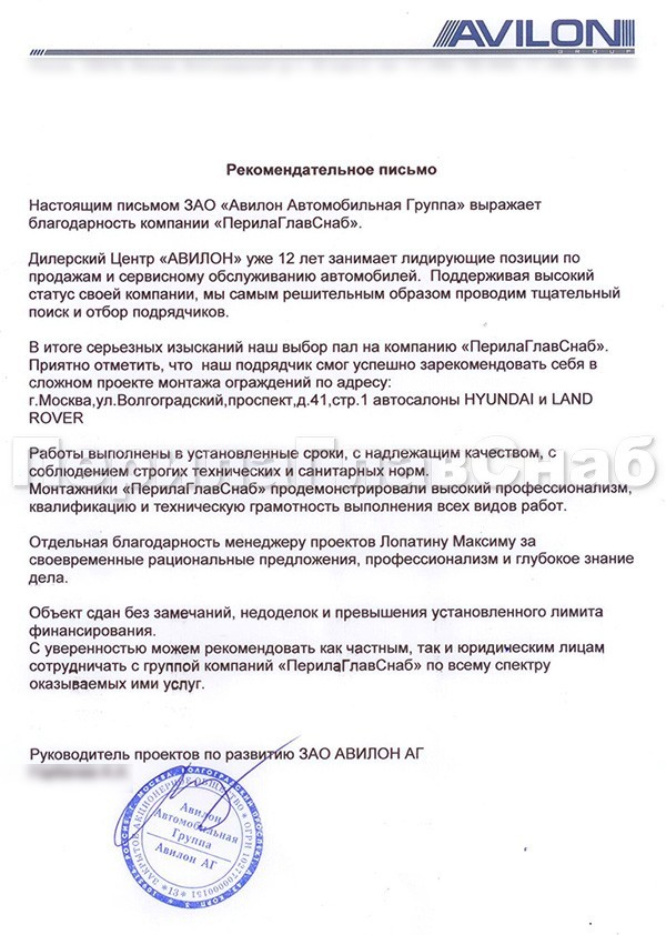 благодарность сотрудникам ООО «ПерилаГлавСнаб» от компании Авилон Настоящим письмом ЗАО «Авилон Автомобильная Группа» выражает благодарность компании «ПерилаГлавСнаб».