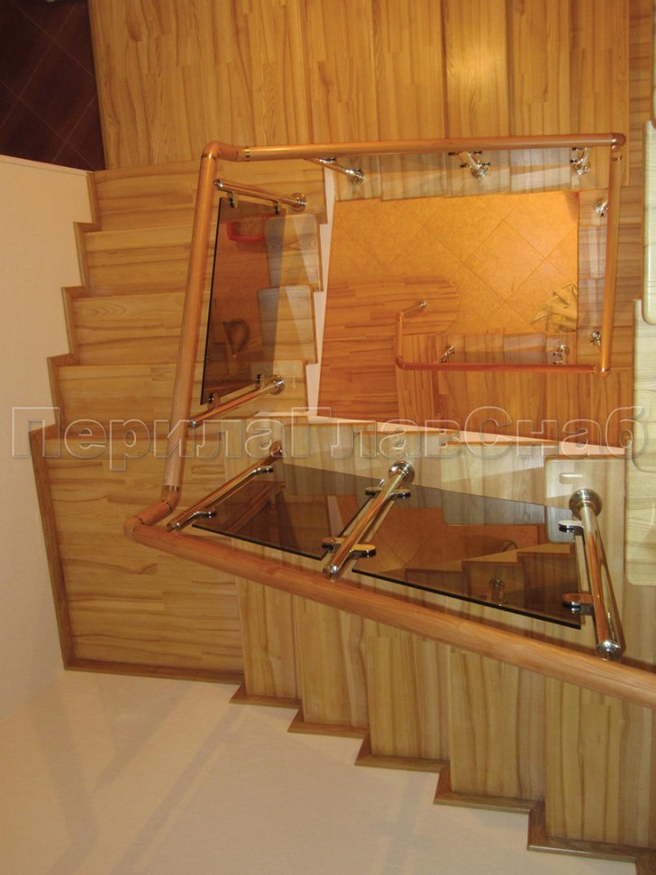 Ограждение с круглым деревянным поручнем с зажимными стеклодержателями и стойками с деревянными вставками