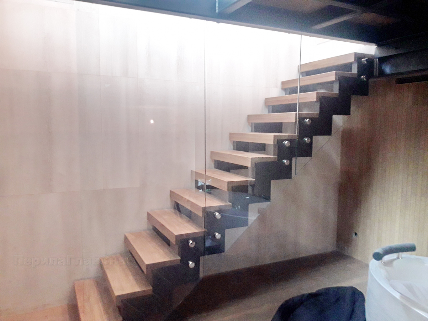 Ограждение лестницы с квадратными стойками и пластинчатыми стеклодержателями в Волгограде. Готовые проекты ПерилаГлавСнаб