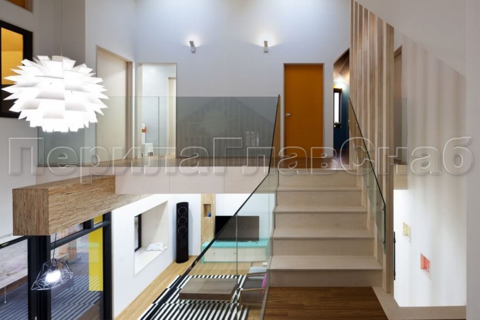 Ограждение с деревянным поручнем на точечном креплении на лестнице
