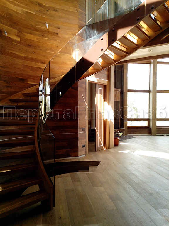 Винтовая лестница с перилами из несущего стекла