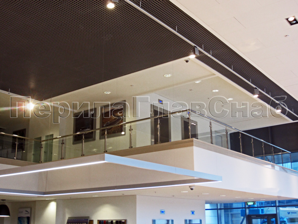 Наиболее удачные решения готовых стеклянных перил в бизнес- и торговых центрах.